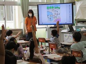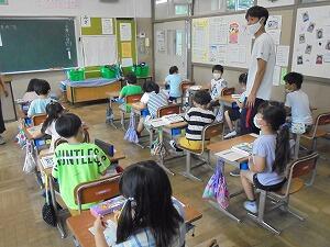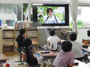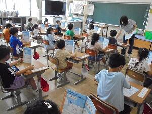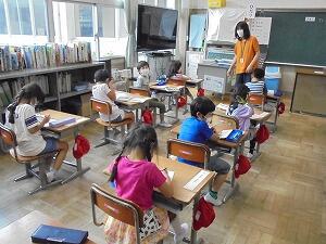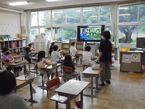 5時間目、1年生が教室で音楽の勉強をしていました。
