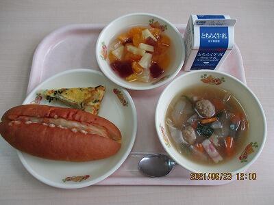 今日の給食の献立は、【ピザドック・牛乳・スペイン風オムレツ・肉団子スープ・フルーツカクテル】でした。