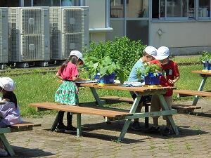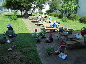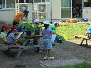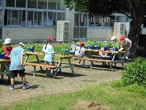 生活科の時間、1年生が自分の育てている朝顔の観察をしていました。