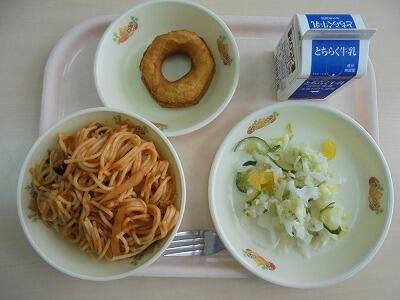 今日の給食の献立は、【ツナトマトスパゲティ・牛乳・フレンチサラダ・卵ドーナツ】でした。