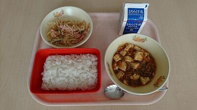 今日の献立は、ご飯、麻婆豆腐、キムチ和え、牛乳でした。