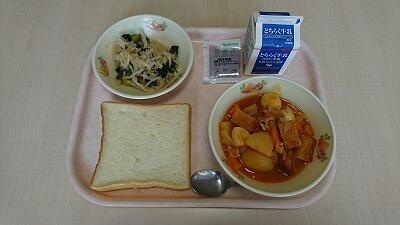 今日の献立は、食パン、とちおとめジャム、インド煮、切り干し大根サラダ、牛乳でした。