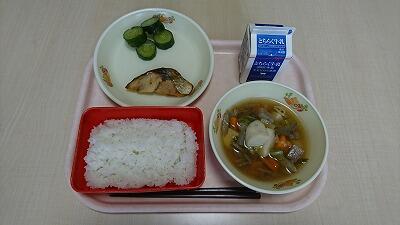 今日の献立は、お魚ランチで、ご飯、アジの塩焼き、キュウリのコロコロ漬け、鶏ゴボウ汁、牛乳でした。