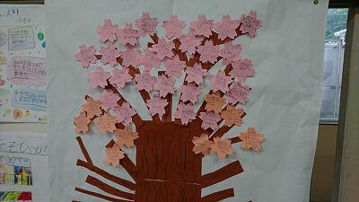 友達のよいところや感謝の言葉を花の形の付箋に書いて掲示しています。