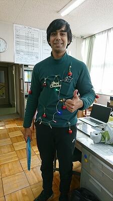 クリスマスが近いということで、トレーナーに電飾と飾りをつけて、クリスマスツリーのようになって授業をしてくれました。