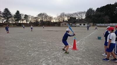 カラーコーンの上に置いたボールをバットで打つ、野球に似たティーボールを楽しみました。