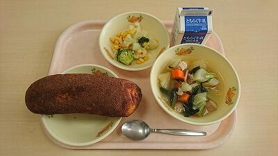 今日の献立は、ココア揚げパン!、ポトフ、花野菜サラダ、牛乳でした。