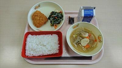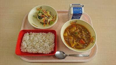 今日の献立は、大麦ご飯、ポークカレー、ごぼうサラダ、牛乳でした。