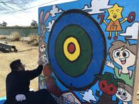 これは子供たちがデザインし、全校児童で少しずつペンキで色をつけた的当て台です。