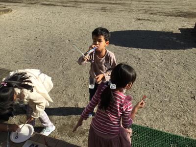ボランティアのなかよし先生が来てくださいました。今日はストローを使ってシャボン玉遊びをしてくださいました。とても楽しそうでした。ありがとうございました。