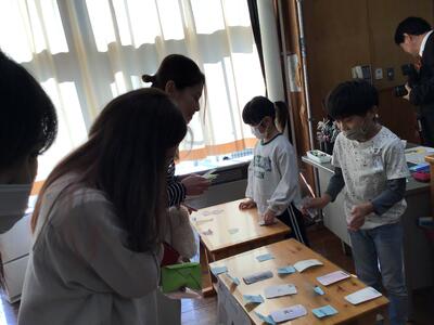 昼休みに、低学年の児童たちが図書支援員さんに貸し出し本の受付をしてもらっていました。スタンプが全部たまり、しおりのプレゼントをもらった児童もいました。たくさん本を読んでいます!
