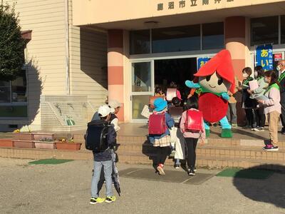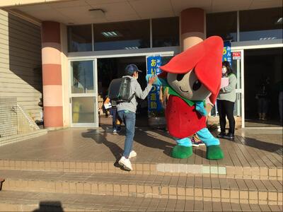 児童の登校時、南押原地区青少年育成市民会議の委員さんが、子供たちの健やかな成長のために「あいさつ運動」に来てくださいました。昇降口で出迎えてくれたベリーちゃんとハイタッチをして教室に向かいました。「おはようございます」のあいさつがいつもよりも大きく響きました。ノートのプレゼントもいただきました。大変ありがとうございました。