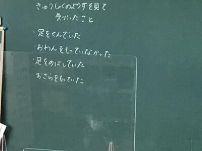 2年生の国語の時間です。観察したエビやクワガタ、アジサイなどを色、形、触った感じなどに分けてメモをし、文章にしていました。詳しい観察文が書けそうです。