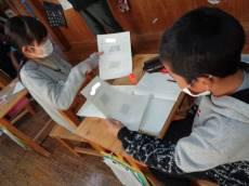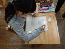 図工の時間です。立体的なカードを作っていました。誰にあげるのか、真剣な表情で切ったり、貼ったり、作り方を先生に質問したりしていました。