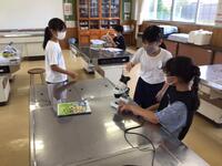 5年生は理科の時間に、へちまの花粉を採取して顕微鏡で覗いて見ました。「わあ、すごいよく見える」「黄色い米粒みたいだ」一人一台顕微鏡を使って覗いてみました。