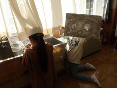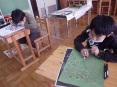 3・4年生、図工の授業です。版画をやっていました。多色刷りの作品ができます。