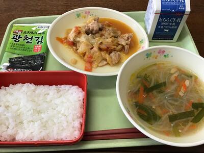 ご飯、牛乳、チーズタッカルビ、春雨スープ、韓国海苔