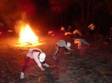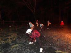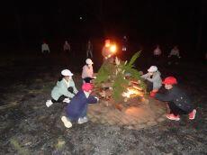 夜は雨になるかと心配しましたが、キャンプファイヤーを外で無事に行えました。「遠き山に日は落ちて」と、歌っているとどこからか山の神がやって来ました。