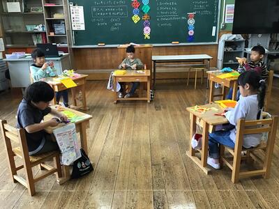 1年生は教室の飾りを作る学習でした。折り紙をたたんで、切って、すてきな飾りを作っています。 はさみの使い方もとても上手で感心しました。