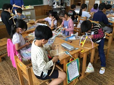 5・6年生は棒状の厚紙を組み合わせて、カゴやボールやラケットなどを作っています。どんな風につなげば、思うような形になるか、試行錯誤しながらチャレンジしていました。
