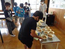 給食配膳の様子です。新型コロナウイルスの感染状況から配膳は職員が行っています。