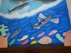 5・6年生は、地域の名所や特色がわかることを絵にしていました。判官塚古墳やいちご、千葉省三などを描いていました。出来上がりが楽しみです。