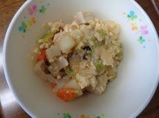 今日の給食は、親子煮です。鶏肉と卵で親子煮です。そこに、凍り豆腐も入っています。