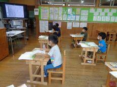 1年生の国語の授業です。読み取りの学習をしていました。ワークシートに書いた答えを先生と一緒に声に出して読んでいました。