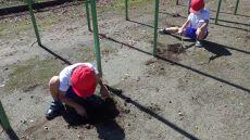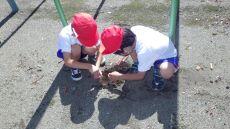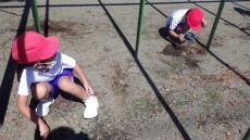 モグラが掘ったと思われる盛り上がった土を1年生が掘っています。「モグラの地下通路だ。」と、言いながらケヤキの枝で土の中を探っています。「深いよ。続いているよ。」「モグラはいるの。」楽しい会話が続きます。一人、二人、三人と子どもたちが集まってきました。穴掘りは昼休みも続きました。