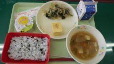 献立:わかめご飯・牛乳・ベリーちゃんの厚焼きたまご・お浸し・のっぺい汁・お月見ゼリー