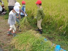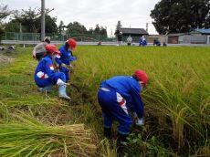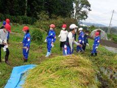 ずっと延期になっていた稲刈りを今日実施しました。全校児童出席で、みんなで稲刈りをしました。雨が続いていたので田んぼはぬかるんでいました。鎌で刈った後、稲刈り機でアグリサポートさんに刈っていただきました。苗の仕立てから田植え、水の調節、草刈、除草剤の散布などたくさんの仕事を多くの人に行っていただきました。感謝でいっぱいです。子どもたちが書いた作文の中にも「様々な人が携わって米ができているのだな。協力の大切さや米があるありがたさが伝わってくる稲刈りでした。」という感想が入っていました。本当に感謝です。