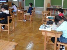 1年生の国語の授業です。読み取りの学習をしていました。ワークシートに書いた答えを先生と一緒に声に出して読んでいました。
