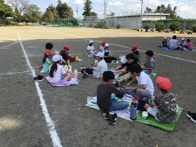 今日の昼食はお弁当でした。どのクラスも校庭で食べることになったようです。