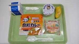 ☆防災救食;救給カレー・牛乳・かぼちゃのマフィン・県産ヨーグルト・バナナ