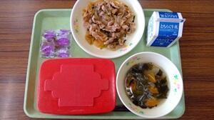 ☆セルフ豚キムチ丼(ご飯)・牛乳・豚キムチ丼の具・冬瓜のスープ・果汁グミ