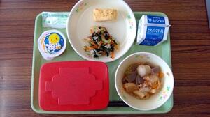 ☆お月見献立;ご飯・牛乳・ふと巻き卵・おかか和え・里芋と大根のそぼろ煮・月見ゼリー