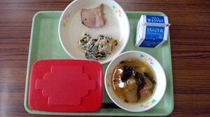 ☆さつきランチ(特産物献立);わかめご飯・牛乳・モロのスタミナ焼き・にらサラダ・干瓢の味噌汁