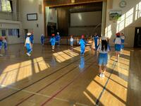 業間はなわとび練習です。歌えバンバンの曲に合わせて準備運動をします。