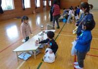 内容は「あきのたからものランド」です。この日に向けて2校の子ども達は、どんぐりや松ぼっくり、紙コップや割りばしなど身近な材料を使って、楽しいおもちゃや景品をたくさん作ってきました。これらをもとに、1・2年生が「お店屋さんとお客さん」、保育園の子ども達が「お客さん」になって交流します。