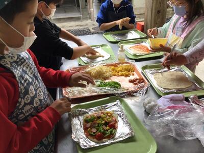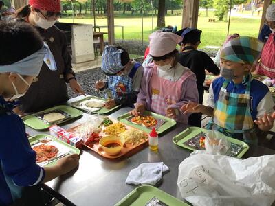 いよいよ3日目となりました。朝食を食べ、部屋を整頓し、野外調理を行います。ピザをみんなで力を合わせて作ります。