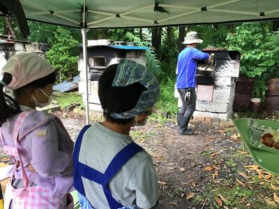出来上がったピザを窯に持っていくと、雨の中、センターの先生が焼いてくださいます。とてもいい匂いです。