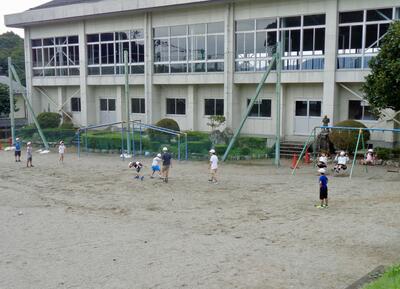 今日は、からりとした晴天です。業間は、ペア学年での共遊を行いました。1年生と6年生、2年生と4年生、3年生と5年生がペアになって遊びます。上の学年が中心となって遊びを進めます。今日は、どのペアもドッジボールを行いました。柔らかいビニールボールやフリスビーを使う学年もありました。