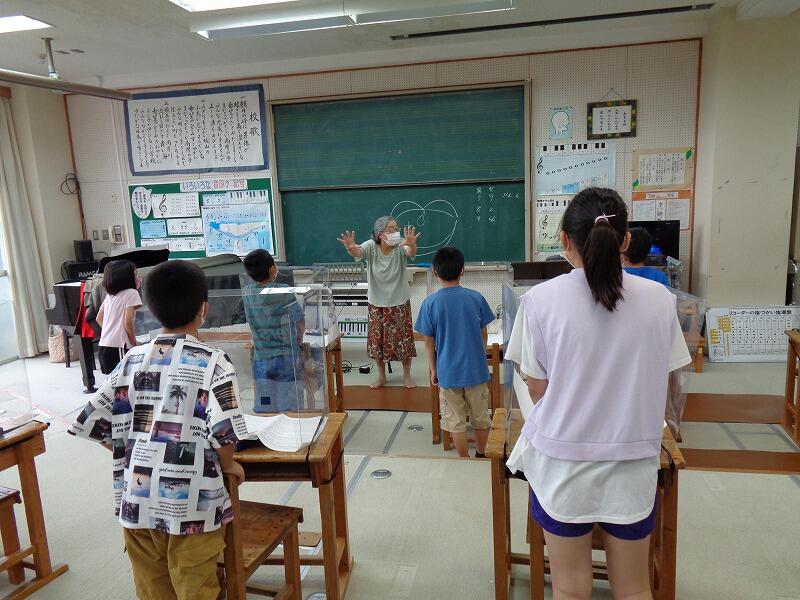 9月8日(木)、今日は、4年生の音楽にVTを招き、歌唱指導をしていただきました。感染症対策のため、アクリル板で仕切ったり、マスクを着用したり、間隔を開けたりしながらの、学習でしたが、発声の方法などをご指導いただきました。きれいな声が出せるようになり、「歌って楽しい。」とつぶやいた子供たち。感染に気をつけながら、できることに取り組んでいきたいと思います。