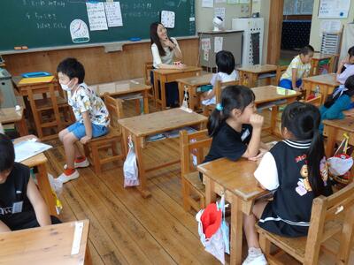 学校長の話では、「夏休みのおみやげ」について話しました。「夏休みのおみやげ」は、自分が夏休み中にがんばったこと、できるようになったことです。ぜひ、夏休み中に、いろいろなことに挑戦して、8月28日の第2学期始業式の日には、自分が手に入れた「夏休みのおみやげ」について先生たちに教えてほしいということも話しました。