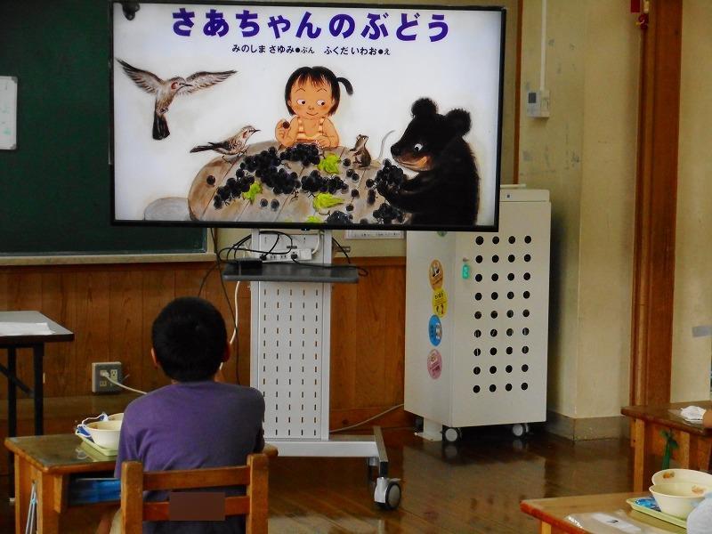 9月27日(火)、今日は、給食のデザートとしてぶどうが出されました。これは、南摩のぶどう園で、南摩中の生徒さんが収穫してきたものです。これにちなんで、今日は「さあちゃんのぶどう」という絵本の読み聞かせがありました。児童が事前に読んで録画したものです。ぶどうを友達と分け合いながら食べる絵本のお話を聴きながら、味わうぶどうは、格別でした。読み聞かせの後には、ぶどうについてのクイズが出題され、食材についての知識を深めることもできました。