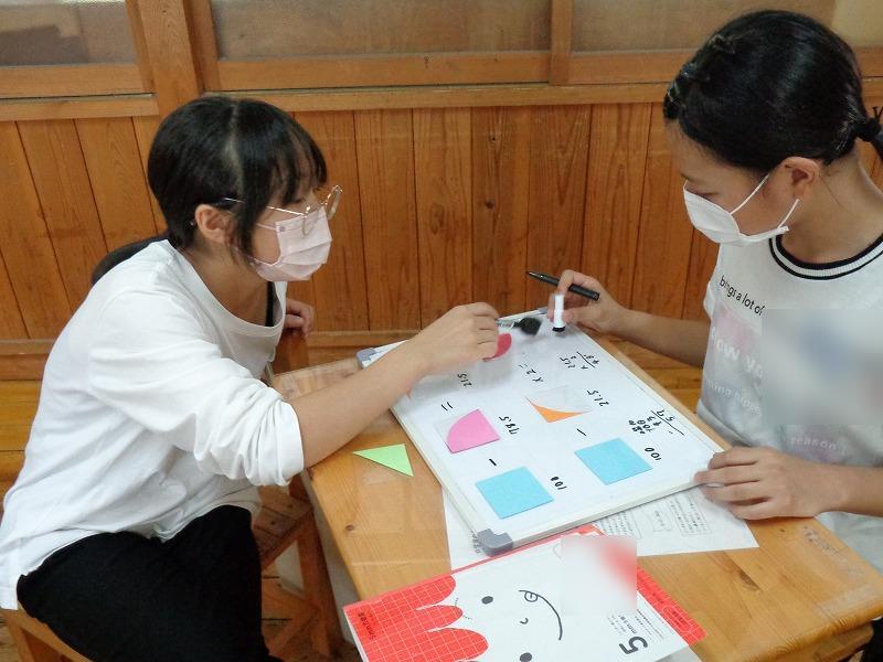 9月28日(水)、5年生は、「分数と小数、整数の関係を調べよう」の学習をしていました。2Lのジュースを3人で分けたとき、分数でどのように表したらよいかを考えていました。図に表しながら、自分の考えを相手に伝えようと、一生懸命説明していました。互いの意見を聞きあいながら、考えを深めている様子がうかがえました。