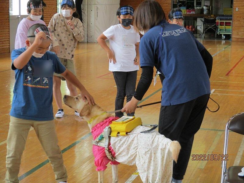 4年生は、総合的な学習の時間に「福祉」について学んでいます。9月22日(木)は、盲導犬協会の方々を招いて、盲導犬についてのお話を伺ったり、質問をしたり、体験活動をしたりしました。「目が見えない状態でも、盲導犬がリードしてくれたので安心しました。」「僕たちが、もっと盲導犬について周りの人たちに伝えていきたいと思いました。」など、子供たちは、多くのことを学んだようでした。
