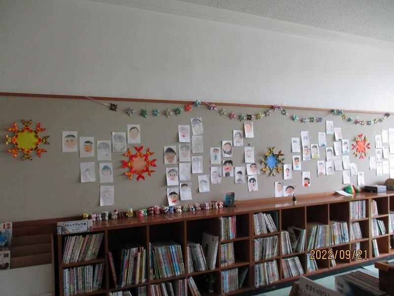お彼岸を迎え、図書室の壁面が秋らしく模様替えされました。KLVの皆さんが、折り紙で素敵な飾りを作ってくださいました。「どうやって、つくったのかな。」と、子供たちは、じっと眺めていました。いろいろな皆様に支えられ、学校の環境が整えられています。