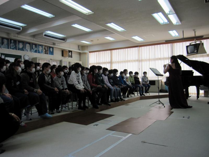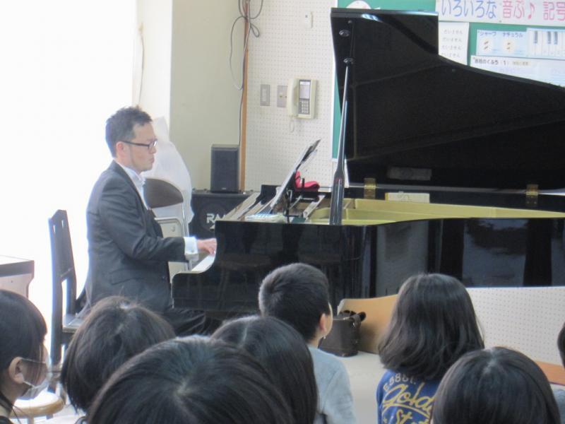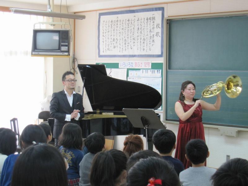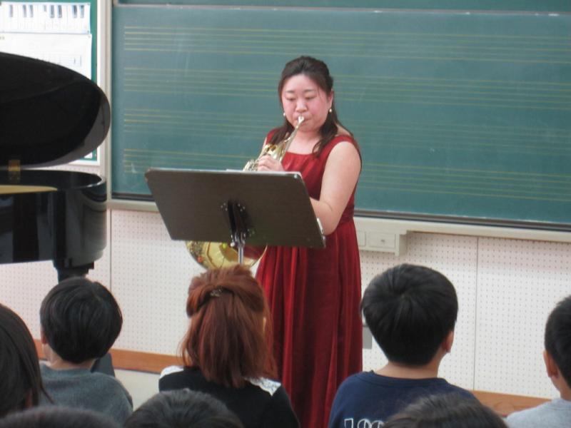 ピアノとホルンの奏でる演奏に、児童達は聴き入っていました。音楽室での演奏だったので、奏者の指使い、表情もよくわかり、その分感動も深まりました。