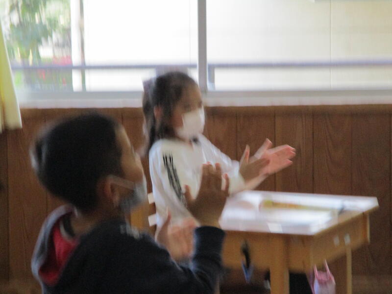 2年生の教室に行ってみると、音楽の授業をしていました。曲に合わせて、楽しそうにリズムをとり、手拍子を打っていました。「ビンゴ、ビンゴ しっているかい・・・・」と、元気に歌いたいところですが、感染防止のため、控えめに口ずさんでいました。早く元気に歌える日が戻ってきますように。
